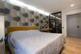 -Спальня с двухспальноц кроватью и ортопедическим матрасом Askona, оборудованной просторной гардеробной и бьюти-зоной.