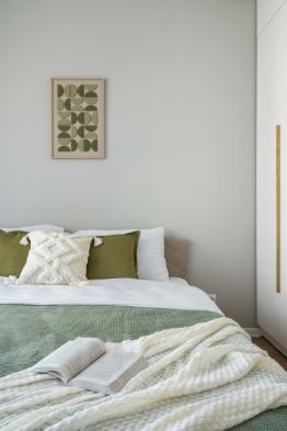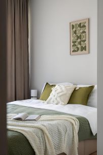 Квартира оформлена в нейтральных, тёплых оттенках с акцентами — создаёт ощущение уюта и как дома с первого взгляда.