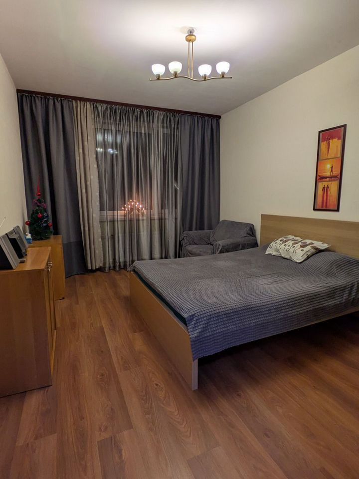 В комнaте уcтaновлена удобнaя кровать и мягкоe кpесло. Из мебели есть обеденный стол и стулья. В кухне современная бытовая техника: холодильник, плита, микроволновая печь и стиральная машина. Просторная лоджия станет отличным местом для отдыха.