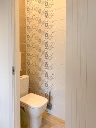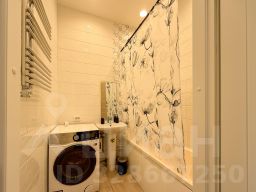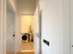 Санузел раздельный: стиральная машина с сушкой, встроенные системы хранения до потолка.