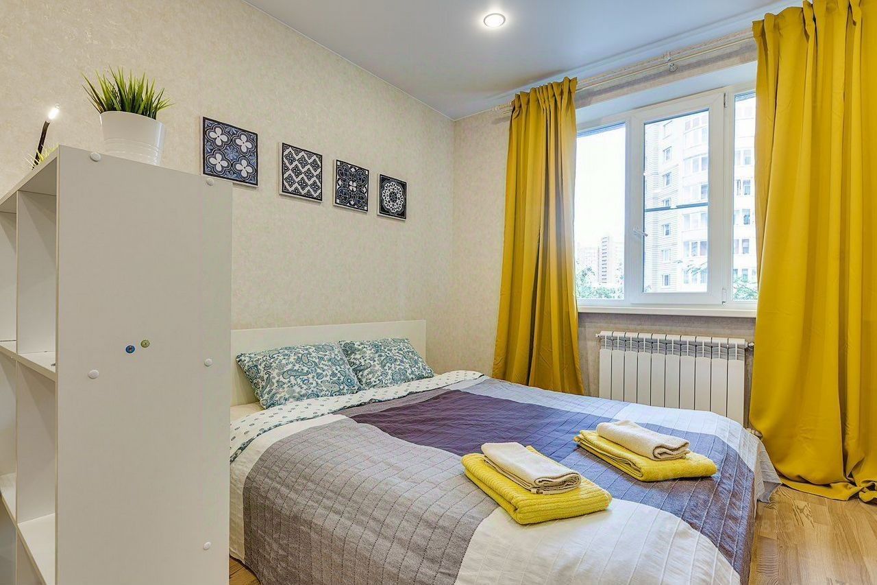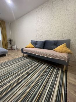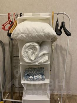 Слева от входа в квартиру-комната, разделенная на 2 зоны стеллажом. Кровать шириной 160 см, диван (тоже раскладывается). Также, в комнате есть комод и вешалка для одежды со скуббом для хранения вещей.