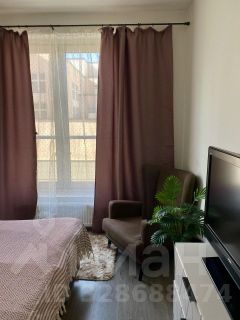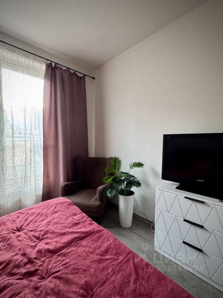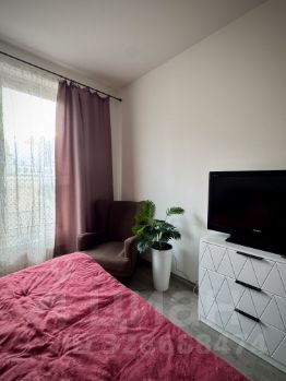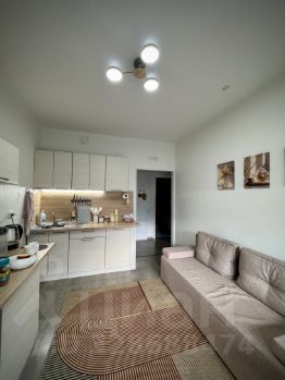 Квартира полностью меблирована: в комнате - двуспальная кровать, комод, кресло и телевизор; в кухне-гостиной - раскладной диван, обеденная зона и функциональный кухонный гарнитур. Кухня оборудована техникой: холодильник, плита, есть посуда и базовая кухонная утварь.