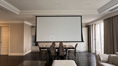 Просторная кухня-гостиная - 58 метров с мягкой диванной зоной и проектором. По периметру гостиной смонтирована акустическая система для лучшего звучания музыки и фильмов.