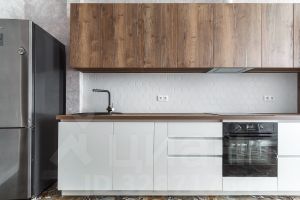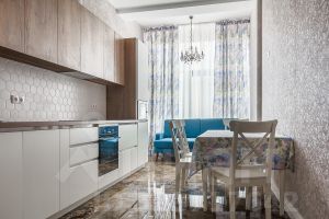 Квартира с евроремонтом, обставлена мебелью на кухне и оснащена всей необходимой техникой: холодильником, посудомоечной машиной, телевизором и стиральной машиной. Санузел совмещённый, в ванной комнате установлена ванна. В доме есть пассажирский и грузовой лифты, а также пандус для удобства передвижения.