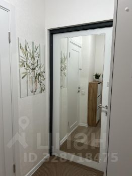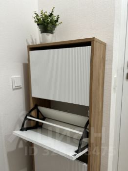 В коридоре: вместительный шкаф с антресолью, пуфик с дополнительным местом для хранения, удобная обувница на 12 пар обуви и большое зеркало на входной двери — всё для порядка и удобства.