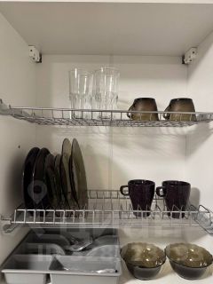двуспальная кровать, 2 шкафа, кухонный гарнитур(духовки нет), стол, стулья, небольшой холодильник, микроволновка, индукционная плита, духовки нет, чайник. Новая посуда (кастрюля, сковорода, столовые приборы), тарелки, чашки. Новый утюг, гладильная доска. Текстиль тоже новый. (постельное белье, полотенца). Есть одеяло и подушки.