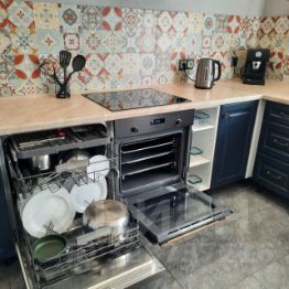 • большая кухня со встроенной бытовой техникой (варочная панель, духовой шкаф, 3х секционная посудомоечная машина 60 см), холодильник, мощная вытяжка, кофемашина, чайник, посуда от кастрюль до стаканов, включая дуршлаг, терку и контейнеры, разные лопатки, шумовки и прочие кухонные приборы для приготовления пищи