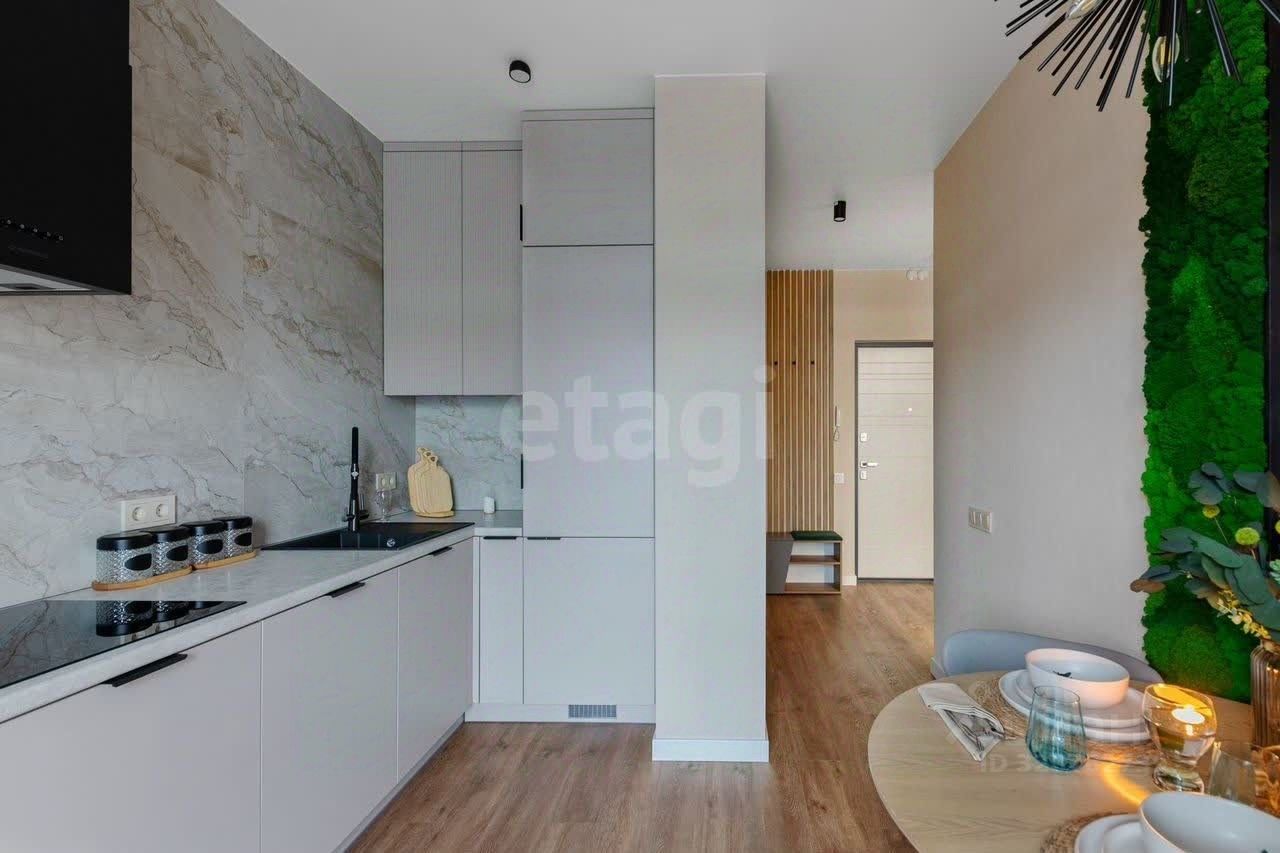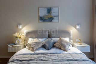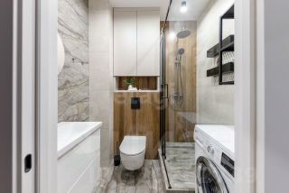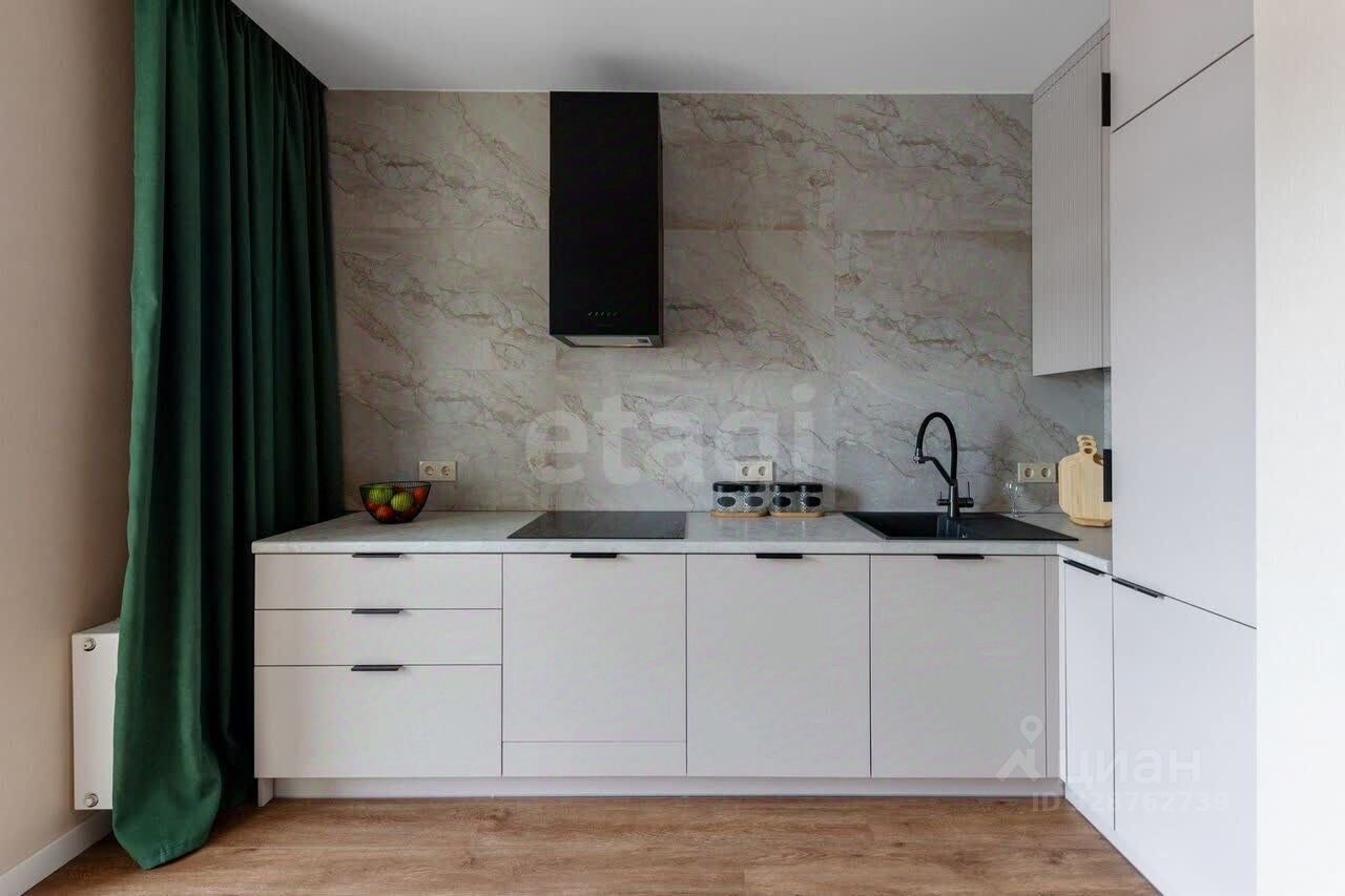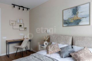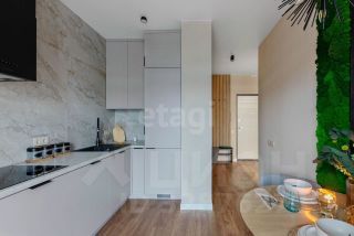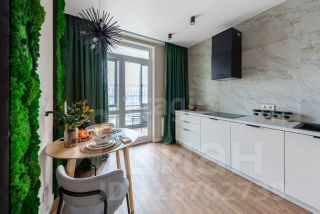 Просторная кухня, застеклённая лоджия, изолированная спальня, гардеробная и совмещённая ванная комната.
