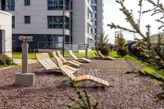 Закрытая охраняемая территория, ухоженный двор с шезлонгами у воды и детской площадкой.