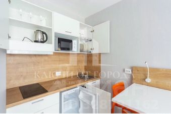 В зоне кухни расположена модульная кухня и вся необходимая техника: телевизор, варочная панель, вытяжка, чайник, микроволновая печь, холодильник. Имеется домофон.