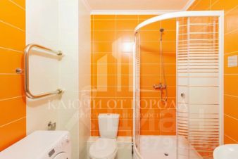 Санузел совмещенный. В санузле душевая кабина, унитаз, раковина, стиральная машина.