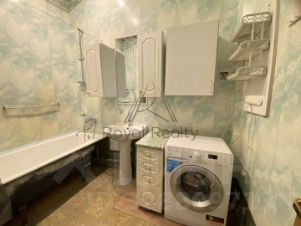 В ванной комнате: установлена стиральная машина, ванна, раковина с зеркалом и шкафчиками для хранения.