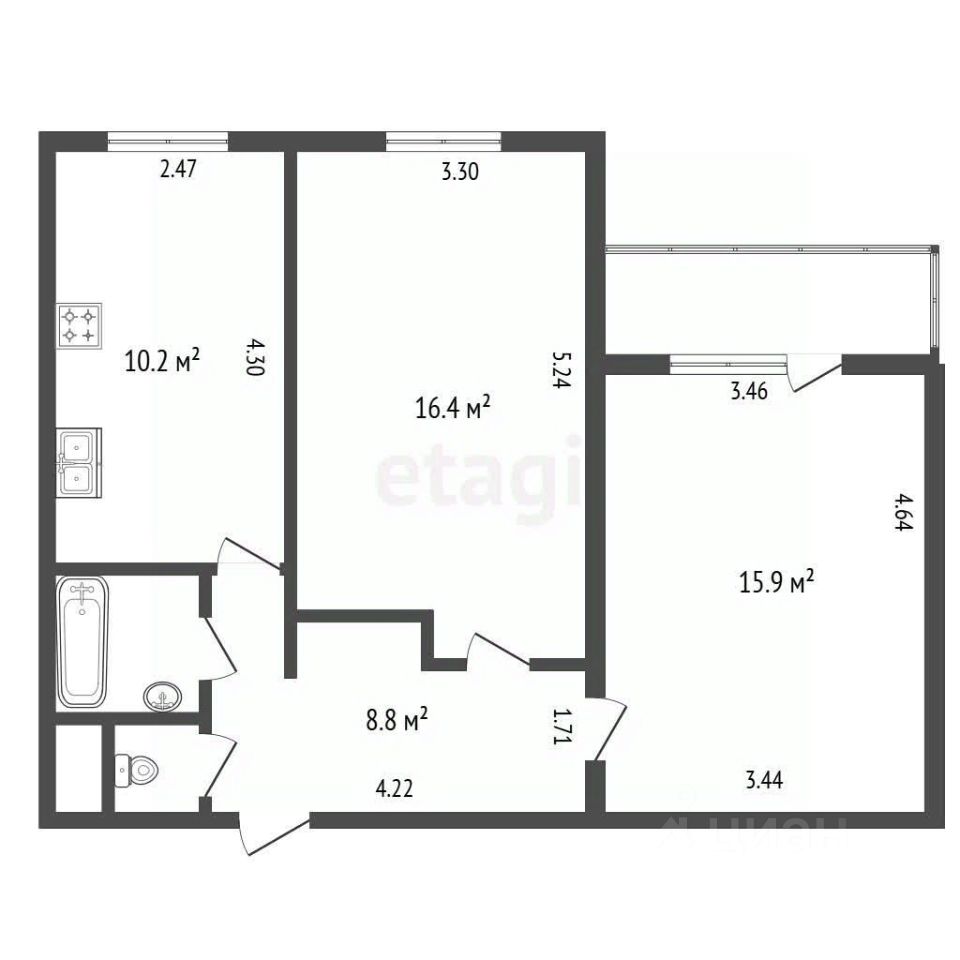 - общая площадь 55м2. Комнаты площадью 15.9м2 и 16.4м2