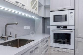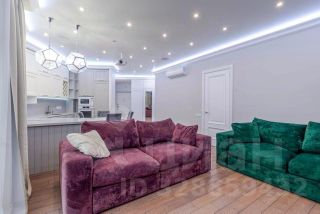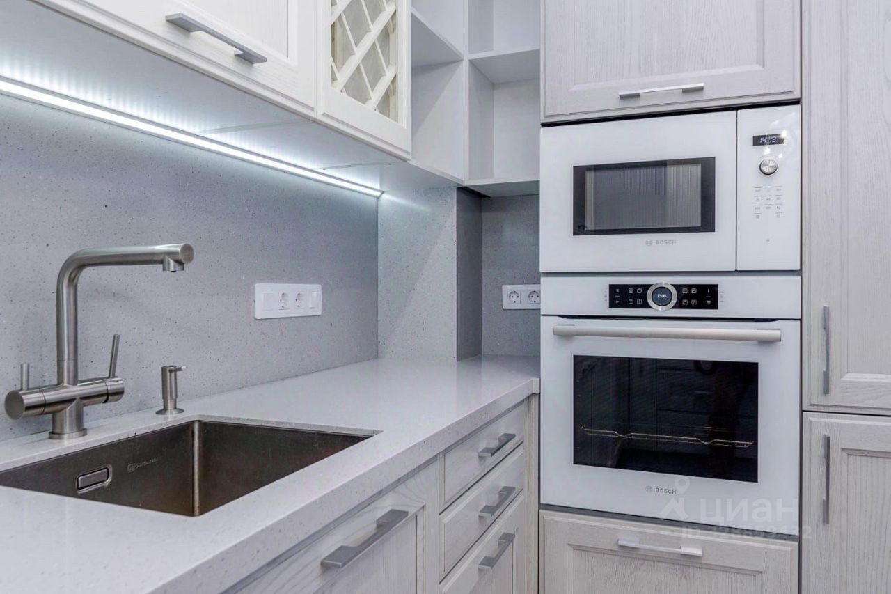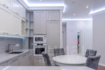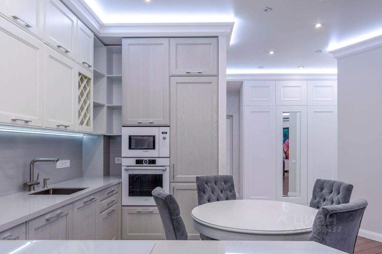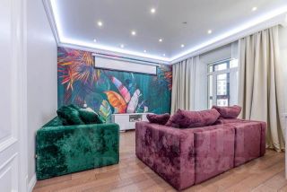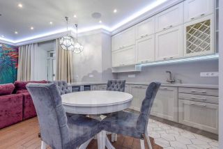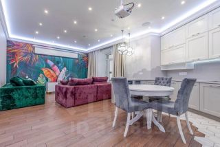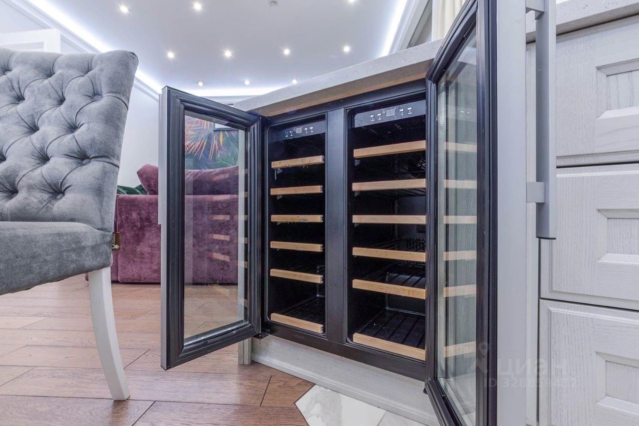 Кухня площадью оборудована современной техникой: встроенная плита, духовой шкаф, микроволновая печь, посудомоечная машина и холодильник, винный шкаф. В гостиной стильное оформление с яркими акцентами, большой диван и обеденный стол создают уютное пространство для отдыха.