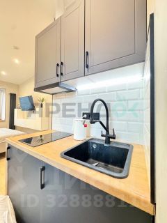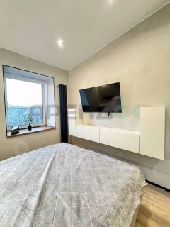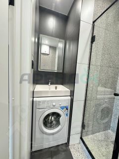 Внутри вас ждет современная кухня с качественной техникой, включая холодильник, электроплиту и микроволновку. Для вашего удобства также имеется стиральная машина. Интерьер выполнен в теплых тонах с акцентом на натуральные материалы, создавая уютную атмосферу.