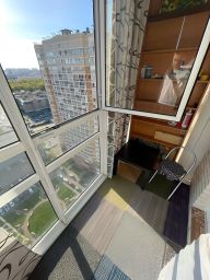 Большой балкон с панарамным остеклением. На балконе дополнительно шкаф, стеллажи, ковровое покрытие, блэкаут - полноценное пространство для отдыха.