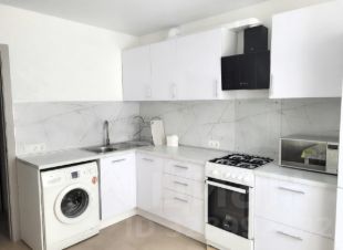 На кухне новая встроенная мебель с выкатными ящиками, газовая плита Gorenje, холодильник Bosch, стиральная машина Bosch. Есть посуда- сковородка, кастрюля, чайник, тарелки, ложки.