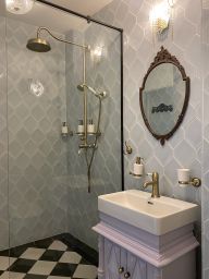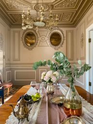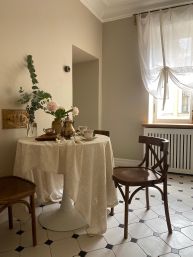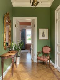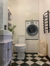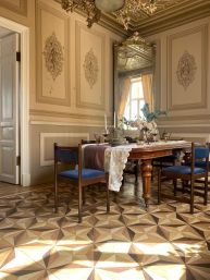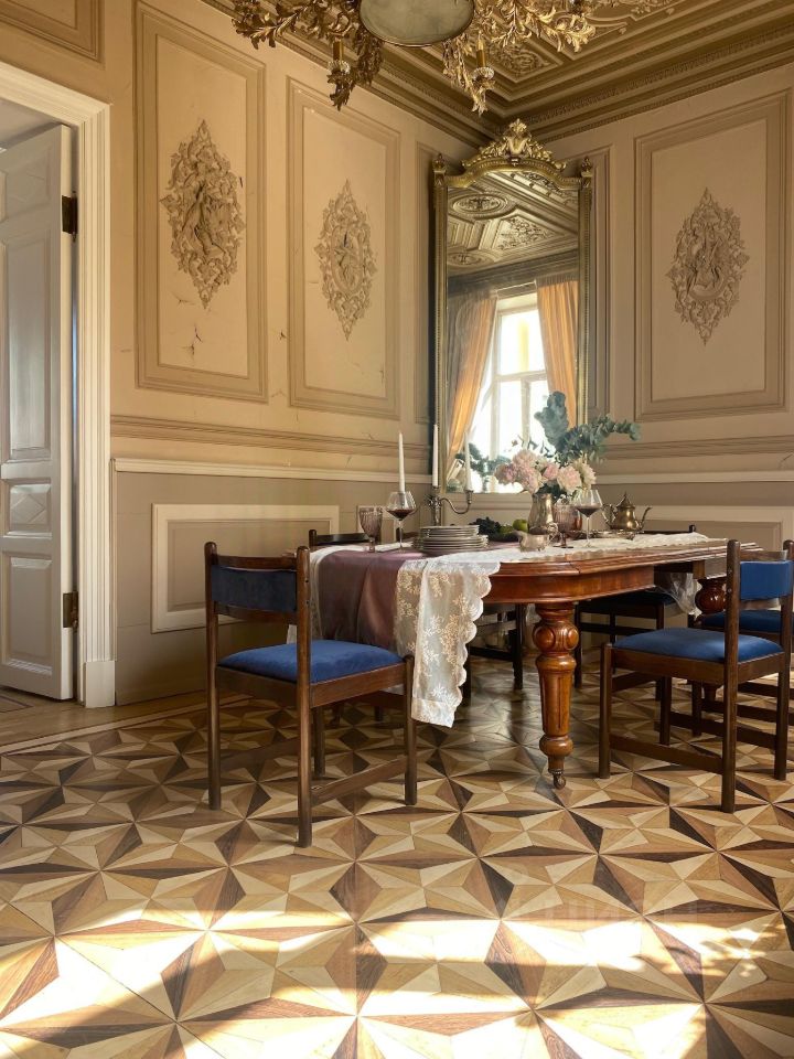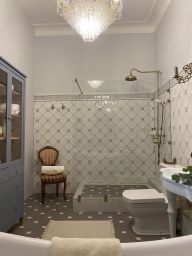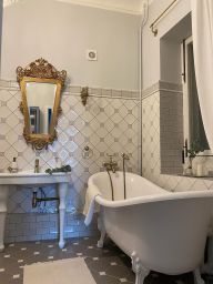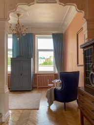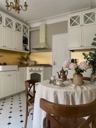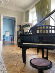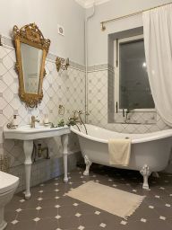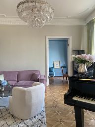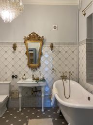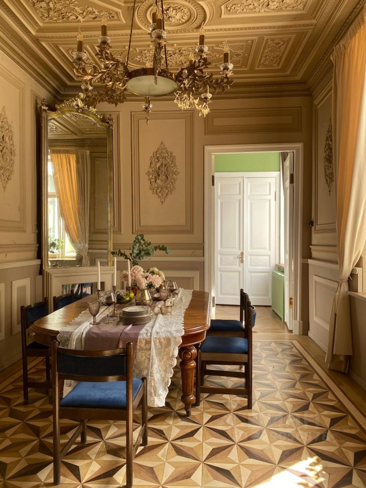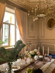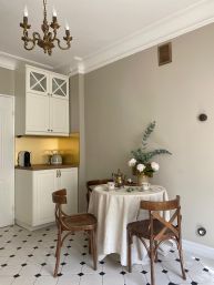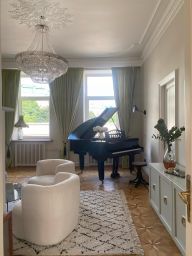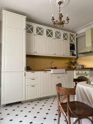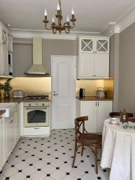 В квартире выполнена реставрация сохранившихся интерьеров по сохранившимся эскизам, произведён качественный ремонт. Сохранены и бережно восстановлены старинная лепнина потолков и стен, настенные панели, наборный паркет полов. Сохранена историческая планировка. В вашем распоряжении будут светлая прихожая, великолепная столовая с изящными лепными картушами, зеркальными медальонами в световых окнах; гостиная с действующим камином и роялем К.М.Шрёдера времён постройки дома и парадная комната свободного назначения, которая может быть вашим кабинетом или уголком отдыха. Интерьеры дополняет уютная спальня с балконом и отдельным санузлом, где есть французская ванная и душевая на выбор. В бывших в XIX веке служебных местах квартиры сейчас гостевой санузел и кухня по последнему слову техники от умной стиральной машины до тостера и чайного сервиза.