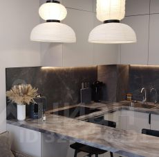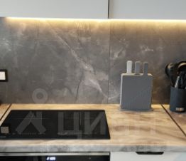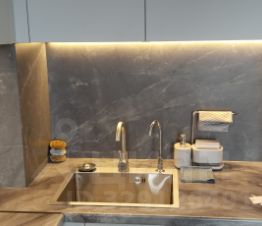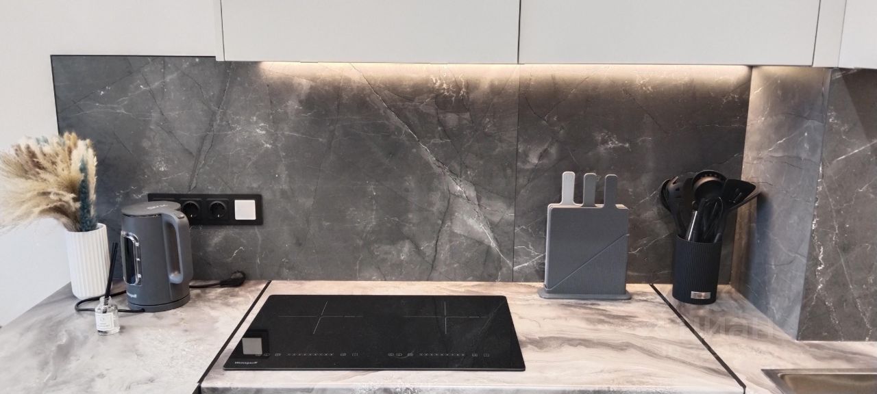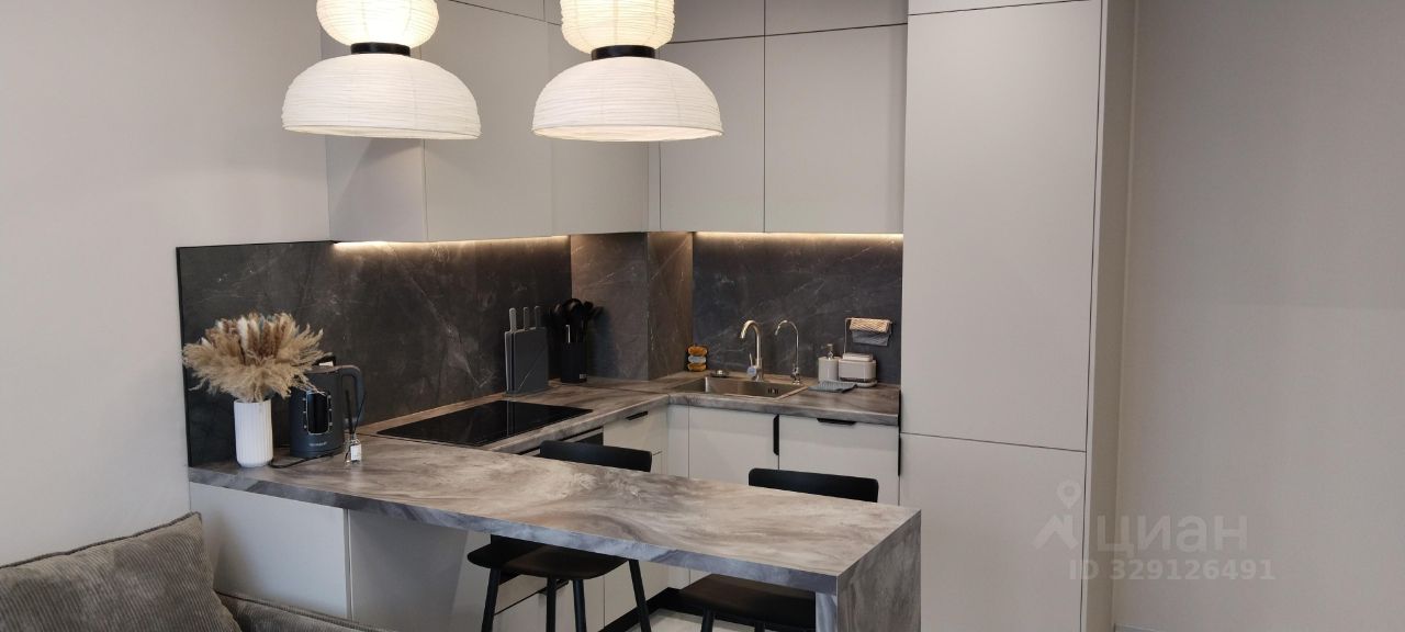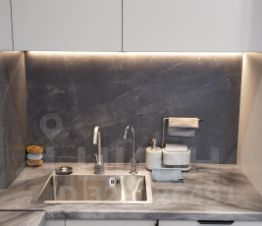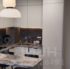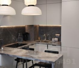 Небольшая, но функциональная и удобная кухня с барной стойкой оборудована современной техникой: духовой шкаф с функцией СВЧ, индукционная варочная панель, вытяжка, посудомоечная машина и встроенный холодильник.