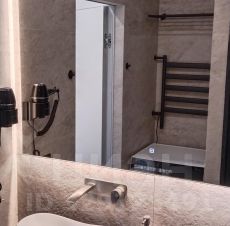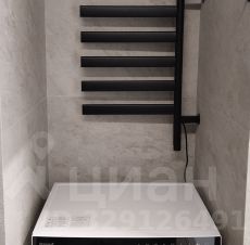 Санузел совмещённый в котором есть инсталляция с гигиеническим душем, встроенная душевая, стиральная машина, полотенцесушитель, фен.