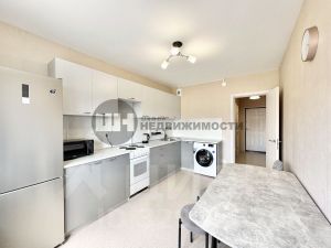 Кухня выполнена на заказ, установлен холодильник и стиральная машина. Есть микроволновая печь и электрический чайник. Новая электроплита с духовым шкафом.