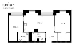 Функциональная планировка: кухня-гостиная 21,3 м², две изолированные спальни. Первая спальня 15,5 м² с вместительной гардеробной, вторая комната 12,8 м² - с собственным санузлом. Всего в квартире 2 санузла.