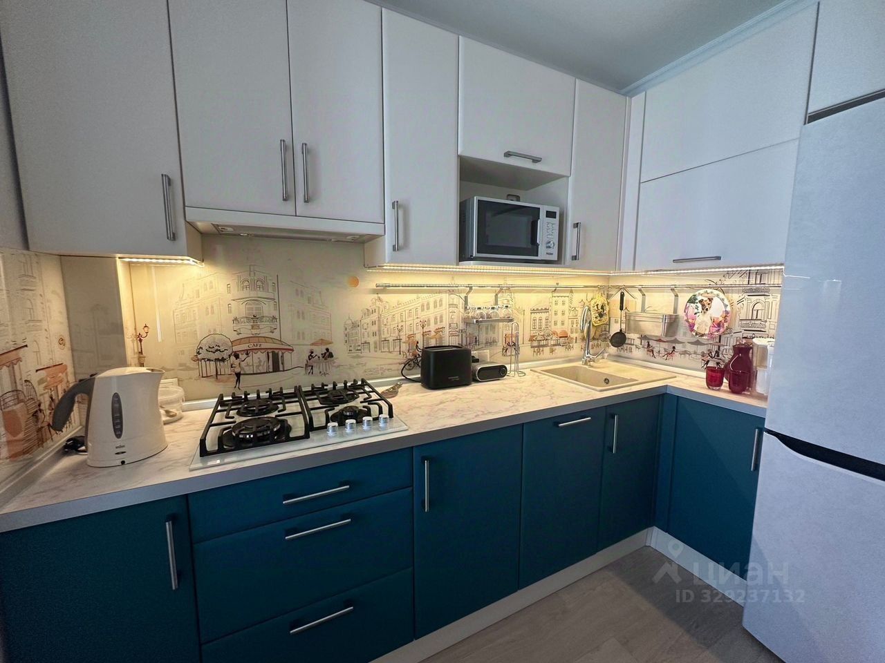 Комфортная кухня обустроена всей необходимой мебелью и бытовой техникой: посудомоечная машина, варочная панель, печь Свч, большой холодильник, тостер, чайник, мультиварка.