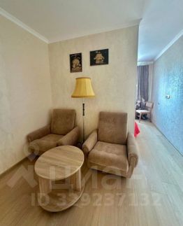 Жилая комната разделена на две части: спальня с кроватью и зона отдыха.