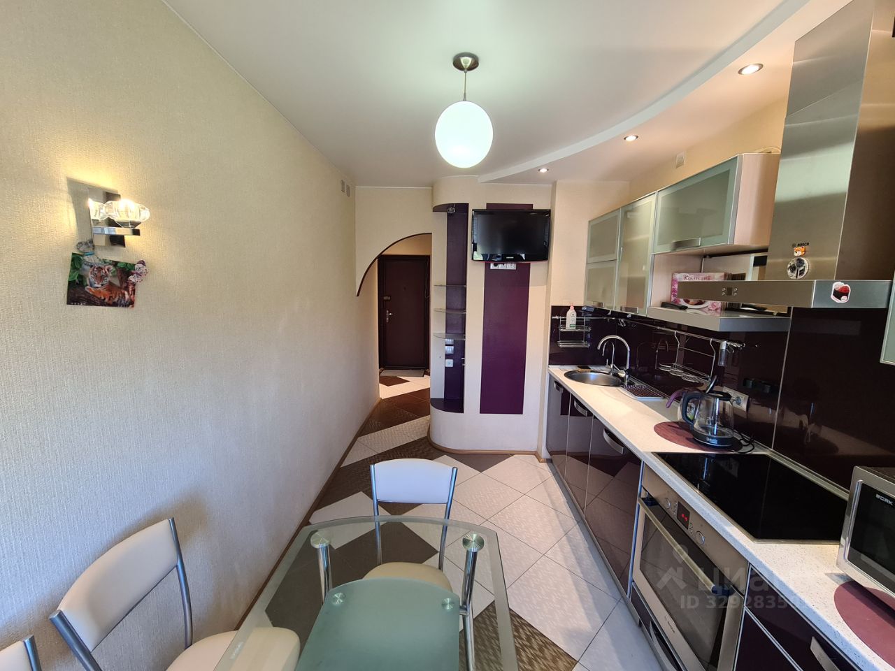 Кухня оборудована всей необходимой техникой, в том числе, посудомоечной машиной и микроволновой печью.