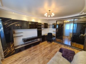 В гостиной комнате спальное место диван, есть зеркальный трехстворчатый шкаф - купе и функциональное рабочее место.