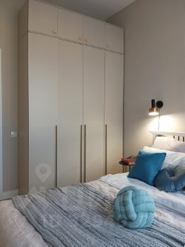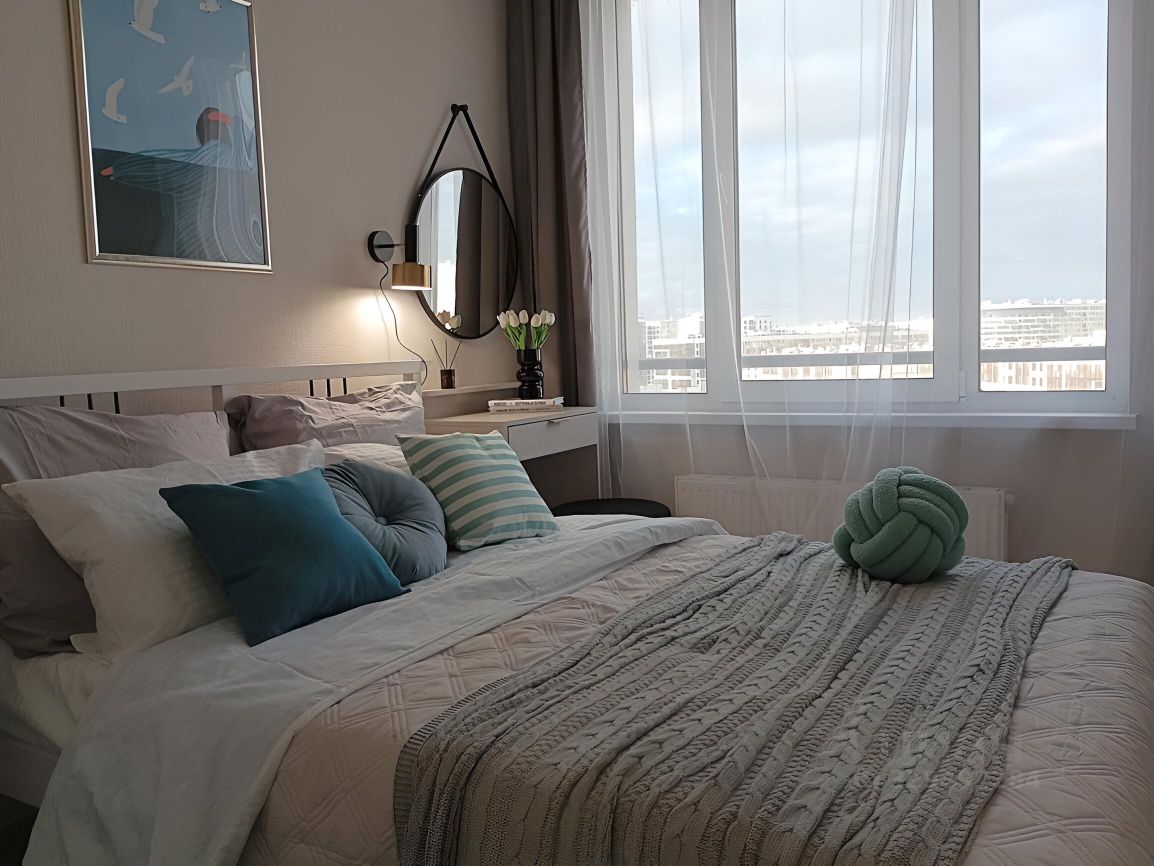 В спальне (11 м2) удобная кровать с ортопедическим матрасом, вместительный шкаф для хранения вещей, макияжный стол.