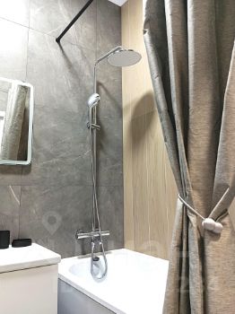 Большой санузел с удобной ванной с тропическим душем, подвесным унитазом, подвесной тумбой и зеркалом с подсветкой. Теплые полы.