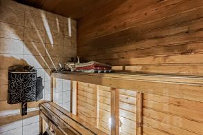 -1 этаж: прихожая, гостиная-кухня с столом на 17 персон, двуспальным диваном, ТВ, bluetooth колонкой, Wi-Fi и светомузыкой, кухня с холодильником, варочной панелью, духовым шкафом, микроволновой печью, чайником и посудой, финская сауна (оплачивается отдельно — 2 000 рублей за 4 часа, каждый последующий час по 500 рублей), ванная комната с душевой и санузлом, отдельный санузел;