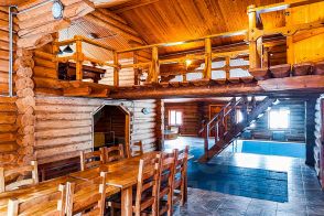 -1 этаж: большая гостиная с кожаной мебелью, дровяным камином, спутниковым ТВ, музыкальным центром, кухня с техникой на 20 человек, 2 уютные спальни с двуспальными кроватями, санузел;