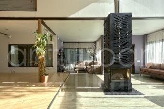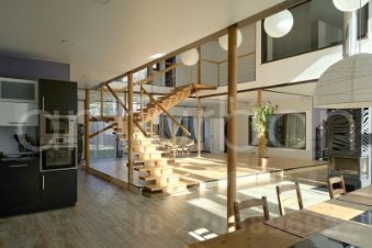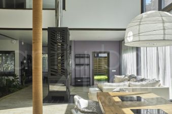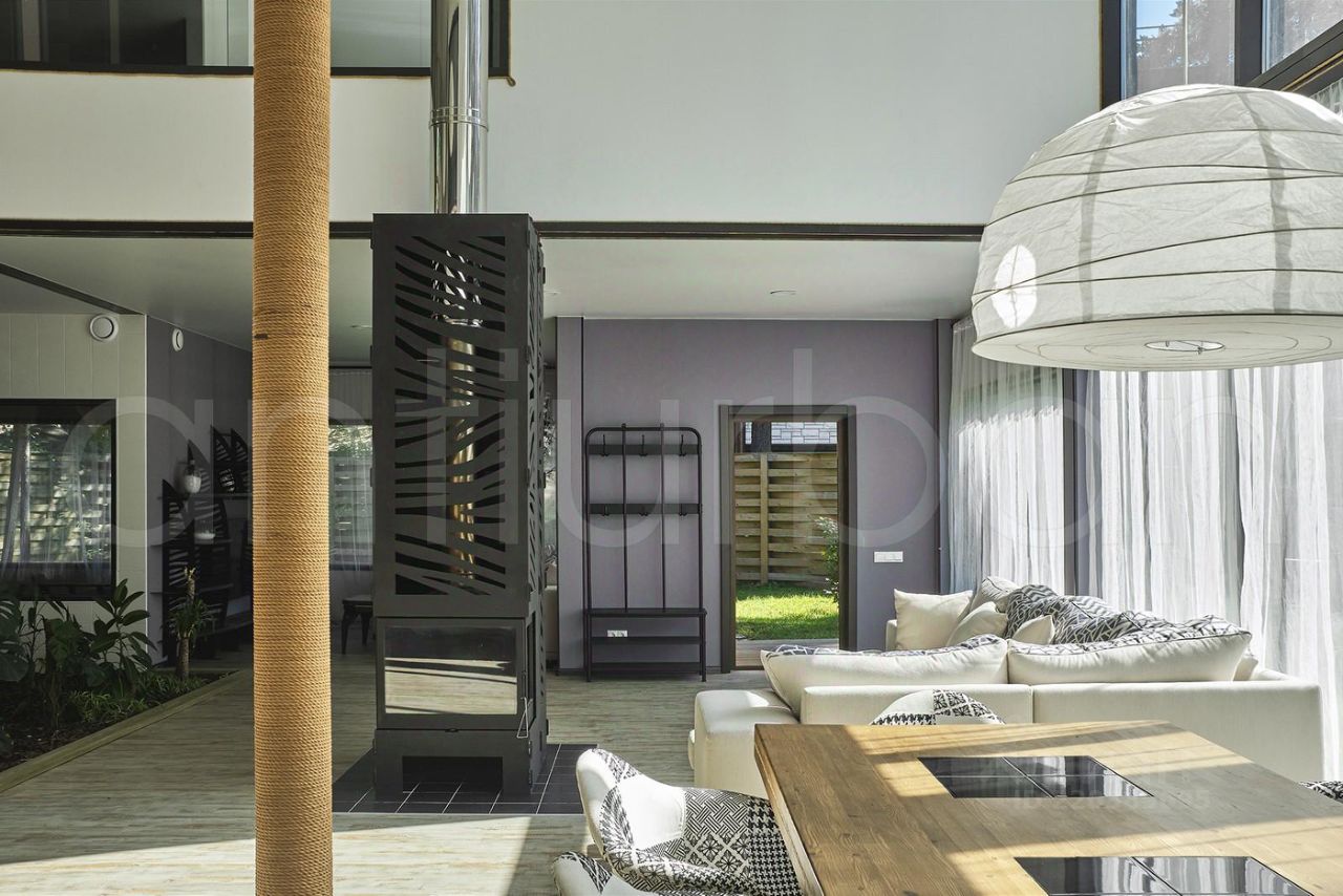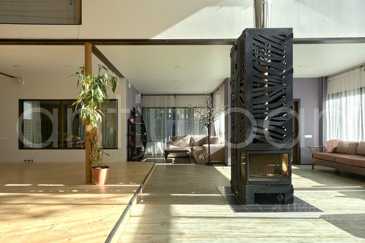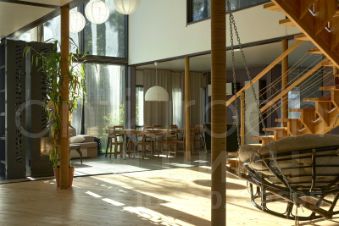 Первый этаж жилого дома: гостиная с кухней и обеденной зоной 120 кв.м с камином, кабинет, сауна, гостевой санузел и хозяйственные помещения.