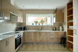 Кухня со всем необходимым: посуда, столовые принадлежности, микроволновая печка, духовой шкаф, посудомоечная машина, чайник, холодильник и т.д.