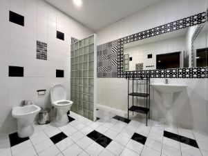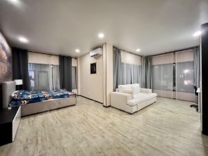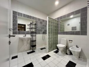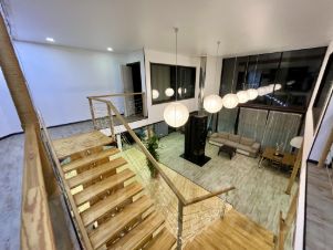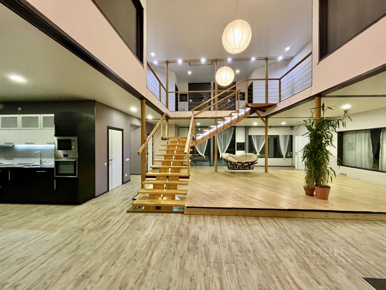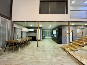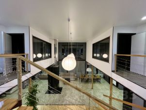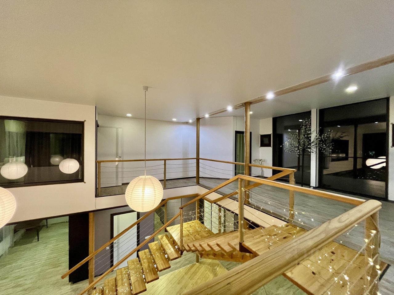 4 спальни расположены на втором этаже, 2 из которых имеют дополнительные окна внутрь дома на гостиную, гардеробные, сауна.