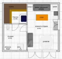 В домике теплые полы, имеется комфортный раскладной диван (размер спального места 180х200), спальные места для двух человек, телевизор, постельные принадлежности, холодильник, микроволновая печь, плита, сковородки, посуда, шампуры, шезлонги.