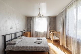 3 спальни (в каждой двуспальная кровать) и кухня-гостиная с раскладным диваном.