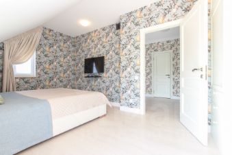 Сдается большой 2-этажный коттедж с дизайнерским ремонтом. Общая площадь всего дома, включая цокольный этаж, 210 кв.м: 1 этаж: большая кухня-гостиная, в которой встроенный кухонный гарнитур, современная бытовая техника, большой диван, комод, камин, просторный санузел, прихожая. Теплые полы. 2 этаж: 3 спальни двуспальными кроватями и 1 детская с односпальной кроватью на 1 этаже, 1 балкон, санузел. Цокольный этаж: прачечная комната, котельная, сауна, комната отдыха с диванами, туалет, душ. Участок полностью ухожен: каменные тропинки, деревья.