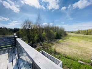 Вид из окна на бескрайнее поле, отсутствие заборов, кругом лес, чистая природа, звёзды, птицы и тишина, много ягод и грибов