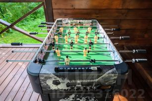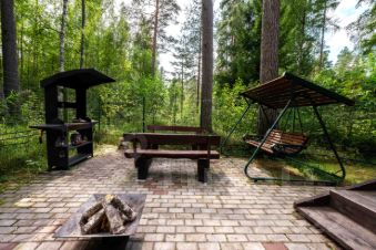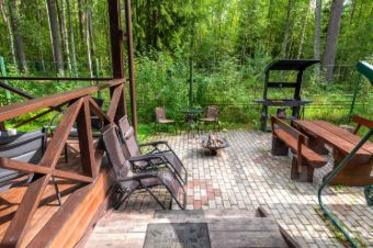 Просторная гостиная с большими панорамными окнами, камином, обеденной зоной, кухней, оснащенной всеми необходимыми кухонными принадлежностями, газовой плитой и холодильником. Большой смарт-телевизор со спутниковым ТВ и бесплатным WI-FI. Гостиная имеет выход на широкую террасу. Рядом с террасой расположена мангальная зона с мангалом под крышей, кастровой чашей, уютным кофейным столиком и жезлонгами, а так же большим столом и скамейками. Имеется гамак, батут и диван-качели для комфортного отдыха.