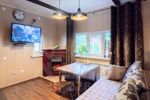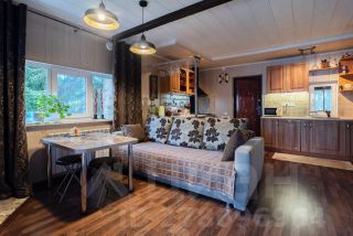Кухонная зона совмещена с гостиной, отдельная спальня, совмещённый санузел и закрытая веранда с выходом в лесную прибрежную зону.