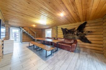 Удобная гостиная с теплыми полами 30м2, с панорамными окнами и выходом на просторную террасу, диваны, столы; телевизор 50" с wi-fi, bluetooth; санузел; баня, бассейн, душевая, кухня: плита, холодильник, посудомойка, микроволновка, чайник.