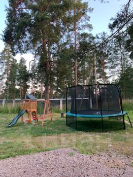 Детская площадка с горкой и качелями, большой батут, лодка.