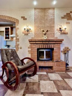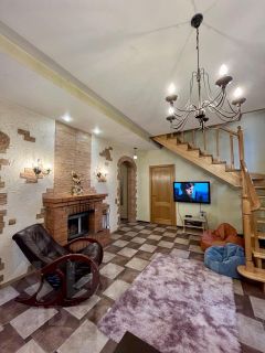1 этаж: санузел, горячая и холодная вода в доме, кухня-гостиная, 1 комната, есть вся необходимая техника и посуда, стол, стулья, камин, телевизор, диван.