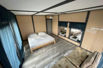 4 теплые спальни (в каждой двуспальная кровать и 2 кресла-кровати, детская кроватка по запросу), из 2 выход на широкий балкон, санузел с душевой, туалетом, холл, второй свет.