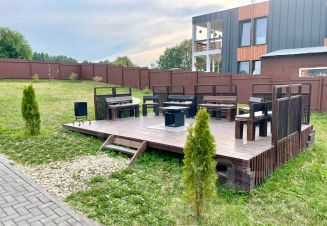 Мангальная зона под крышей с печью для казана; "лобное место" с очагом для костра, ворота с автоматикой; парковка до 6 машин; деревянная купель с подогревом на дровах.