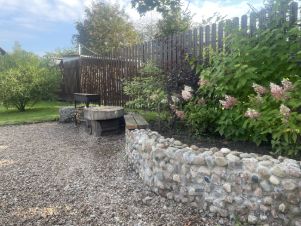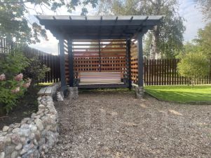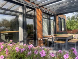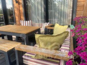 На террасе садовая мебель. Вокруг дома имеется собственная закрытая территория (участок 6 соток), есть мангал, казан. Возможность парковки двух автомобилей. На территории участка - видеонаблюдение. Есть детская площадка на территории: батут (3,5 м.в диаметре), детский домик, песочница, качель.