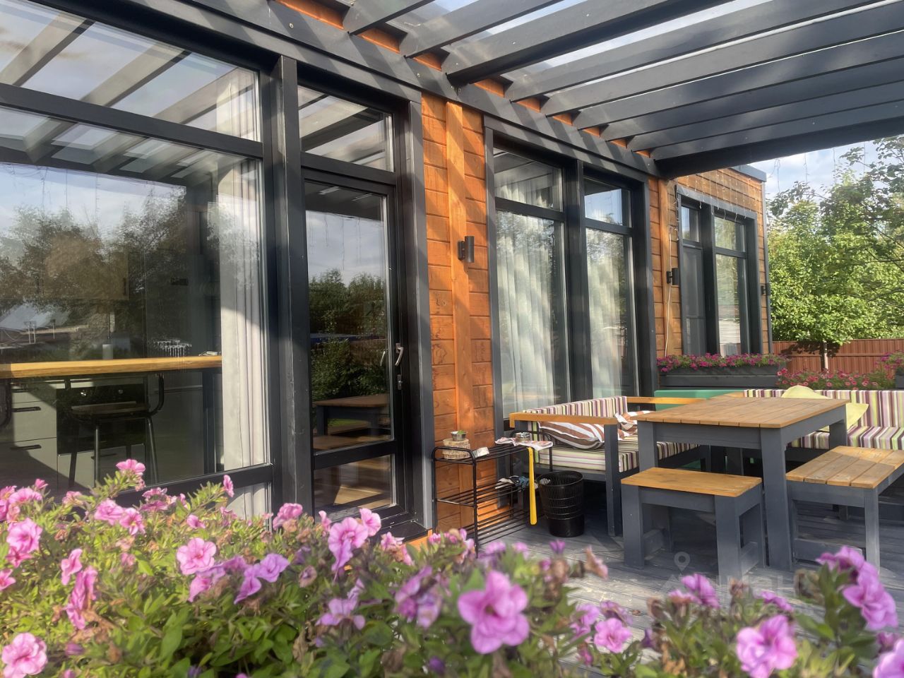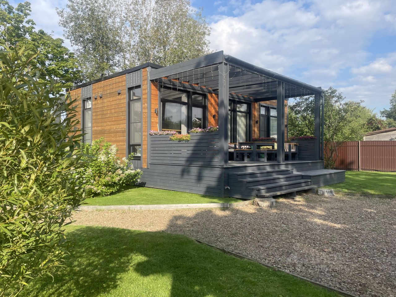 Дом с панорамным остеклением во всех комнатах, с 2мя спальнями, открытой террасой и кухней-гостиной. Площадь дома 54 кв.м.